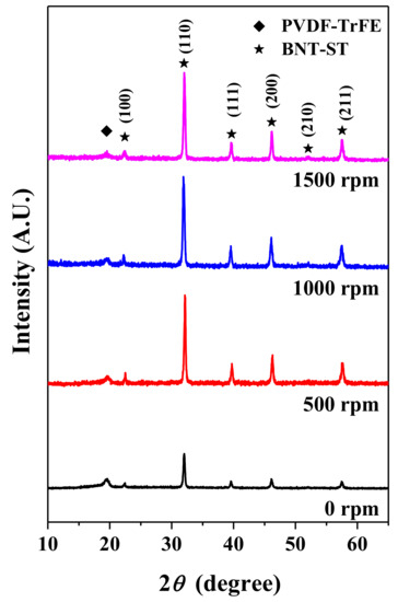 Figure 3 shows the XRD patterns of the BNT-ST nanofibers according to the rotation speed of the collector. First, the XRD peaks at 2θ values of about 19.8°, which corresponds to the (110) reflections of the β phase of the PVDF-TrFE polymer, can be induced by an electrospinning process [12]. The non-polar α-phase of the PVDF-TrFE polymer is generally converted into the polar β-phase due to the electrospinning process and the piezo- and pyroelectric properties mainly result from the β-phase. As a result, the piezoelectric properties of polymer parts are improved by electrospinning. Second, five prominent peaks at 2θ values of about 32.7° (110), 40.3° (111), 46.8° (200), 52.7° (210) and 58.1° (211) corresponding to the perovskite crystal phase of BNT-ST [13] were observed in XRD patterns of the BNT-ST nanofibers with the different collector rotation speeds. This means that the crystal phase of the BNT-ST ceramics did not change with the electrospinning process and the β-phase peak of the piezoelectric polymer and the perovskite peaks of the piezoelectric ceramics coexisted in the nanofiber. Furthermore, as the rotation speed of the collector increased, the polar β-phase peak intensity of PVDF-TrFE was similar but the perovskite crystal peak intensity of BNT-ST was significantly increased. In other words, the β-phase of the piezoelectric polymer was not significantly affected by the rotation speed of the collector but the crystal phase of the BNT-ST ceramics was remarkably improved with increase in the rotation speed of the collector. From these results, it is expected that the piezoelectric performance will be improved as the rotation speed of the collector increases.
