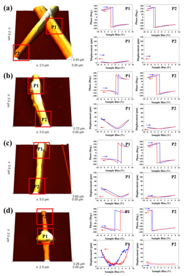To evaluate the nanoscale electromechanical response of the BNT-ST nanofibers with different collector rotation speeds, 3D topography images, phase hysteresis loops and amplitude hysteresis loops were analyzed by PFM as a function of applied DC voltage from −8 V to 8 V, as shown in Figure 4. In the PFM 3D topographic images, with more embedded BNT-ST ceramics, the images are brighter (or slightly protruding) and two areas of P1 (higher ceramic content area) and P2 (lower ceramic content area) were intensively analyzed. The PFM phase hysteresis loops of the BNT-ST nanofibers prepared at different rotation speeds of the collector are directly associated with the polarization switching of the P1 and P2 local regions and the phase changes of the phase hysteresis loops for all the BNT-ST nanofibers were about 180°, which indicated ferroelectric switching under an applied bias. The dipoles in both BNT-ST ceramic and P(VDF–TrFE) polymers seem to be poled along the electric field direction during the electrospinning process and both the P1 and P2 areas were likely to have aligned dipoles regardless of the rotation speed of the collector instead of randomly oriented dipoles [14]. In the amplitude (displacement) hysteresis loops, butterfly-shaped hysteresis loops, a typical strain-electric field (S-E) shape of a piezoelectric material [14,15], were observed at both the P1 area and P2 area of all BNT-ST nanofibers with different collector rotation speeds. The maximum strain (Smax) and the longitudinal piezoelectric coefficient (d33) were calculated based on the amplitude hysteresis loops. For the BNT-ST nanofibers with a 0 rpm rotation speed, which has a random array in the SEM images in Figure 2, 16.95 pm of Smax and 13 pm/V of d33 were observed in the P1 area and 0.92 pm of Smax and 0.7 pm/V of d33 in the P2 area. On the other hand, the BNT-ST nanofibers at a rotation speed of 1500 rpm, which showed the aligned nanofibers in the SEM images in Figure 2, 192.87 pm of Smax and 148.1 pm/V of d33 were observed in the P1 area and 11.04 pm of Smax and 8.4 pm/V of d33 in the P2 area. These results mean that the BNT-ST ceramic phase had greater piezoelectricity than the P(VDF–TrFE) polymer phase and as the rotation speed of the collector increased, the BNT-ST nanofibers became aligned in the advancing direction and had a better piezoelectricity. Furthermore, the piezoelectric coefficient d33 (148.1 pm/V) of the aligned BNT-ST nanofibers at P2 was considerably larger than that of the reported values for the PVDF nanofibers (−58.5 pm/V) and PZT nanofibers (83.4 pm/V) [3,15] and the piezoelectricity of the nanofibers seemed to be improved by the alignment process during electrospinning.