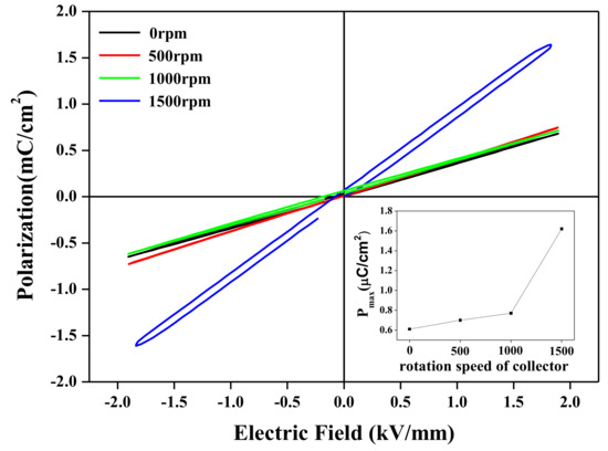 P-E hysteresis loops of the BNT-ST nanofiber modules according to the rotation speed of the collector. The inset shows maximum polarization values (Pmax) according to the rotation speed of the collector.