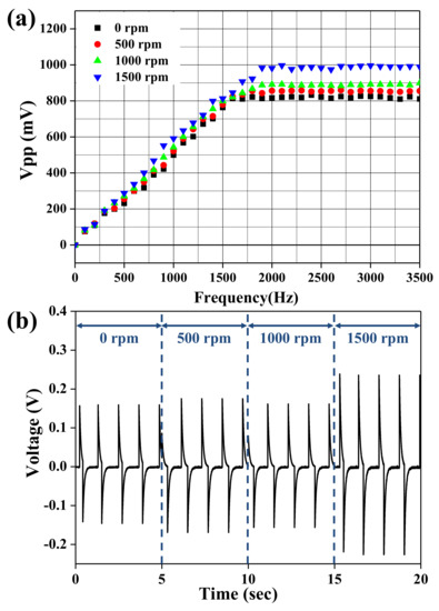 Figure 6a shows the output voltages of the BNT-ST nanofiber modules with different collector rotation speeds according to vibration frequencies from 0 Hz to 3500 Hz. The output voltages of all the BNT-ST piezoelectric nanofiber modules improved with an increase in the vibration frequency and saturated at about 2000 Hz. The higher the rotation speed of the collector and the more aligned the BNT-ST nanofibers became and the output voltages according to the frequency for the BNT-ST nanofiber modules were higher. For the well-aligned BNT-ST nanofiber modules with a rotation speed of 1500 rpm, the saturated Vpp value at 2000 Hz was 0.99 V, which is about a 23.7% increase over the 0.80 V of the saturated Vpp of the randomly arranged BNT-ST nanofiber modules with a 0 rpm rotation speed. As the rotation speed of the collector increased, the saturated Vpp values at 2000 Hz increased. The output voltages of the BNT-ST nanofiber modules with different collector rotation speeds according to bending motion with 1 Hz are shown in Figure 6b. Although the randomly arranged BNT-ST nanofiber modules with a 0 rpm rotation speed had a Vpp value of 0.31 V, the well-aligned BNT-ST nanofiber modules with a rotation speed of 1500 rpm had a Vpp value of 0.56 V. As the rotation speed of the collector increased, the Vpp value according to the bending motion increased. These results indicate that when the piezoelectric nanofibers were well aligned in a certain direction by the increase in the rotation speed of the collector and the well-aligned BNT-ST nanofiber modules had better piezoelectric characteristics. The electric displacement in the BNT-ST nanofiber modules between adjacent electrode fingers of the interdigitated electrodes was parallel to aligned direction and as the polarized direction and the applied voltage direction match, we considered that the piezoelectric characteristics are maximized.
