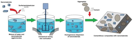 Organic admixtures and different surfactant types [28] are incorporated to facilitate the dispersion process, thus achieving a certain dispersion state. Surface active agents are widely used to improve the homogeneity of dispersion because of the formation of aggregates around nanoparticles [33]. Such action is attributed to the containment of both hydrophilic and hydrophobic groups. The aggregation of surfactants around nanoparticles usually occurs in the form of micelles. The hydrophobic groups interact with the nanoparticles, whereas hydrophilic groups reduce the surface tension of water and thus increase the dispersion of nanomaterial. Unfortunately, many surfactants that are successfully used to disperse nanomaterials, e.g., in polymeric matrices, have been reported to affect the cement hydration kinetics, as well as negatively react with other admixtures. Therefore, methods for the incorporation of plasticizers and superplasticizers (especially polycarboxylate ether-based-PCE) that are compatible with cement have been widely evaluated as dispersants [29,30]. The typical nanomaterial dispersion process prior to the incorporation of cement-based composites is presented in Figure 1.