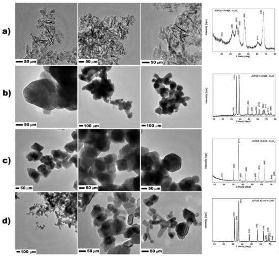 TEM microphotographs and XRD patterns of studied nanoparticles: (a) Al2O3; (b) CuO; (c) Fe3O4; and (d) ZnO.