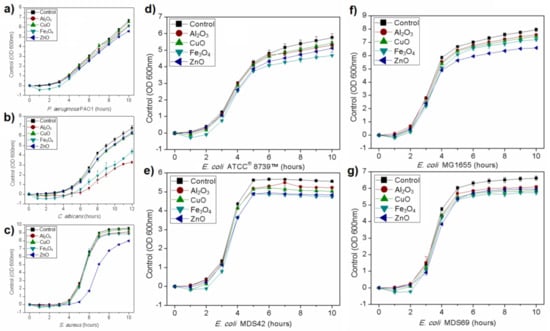 Growth kinetic curves of microorganisms treated with nanoparticles in comparison to control culture: (a) P. aeruginosa; (b) S. aureus; (c) C. albicans; (d–g) four different E. coli strains.