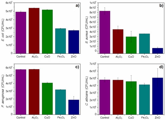 The 4 h toxicity test confirmed the toxicity of studied nanoparticles on selected microbial models in selected dose. Relatively, the highest toxicity was obtained for ZnO nanoparticles. All used bacteria were susceptible to Fe3O4 and ZnO nanoparticles. Surprisingly, the test did not show toxicity of CuO nanoparticles on the used E. coli strain, which was confirmed in an additional round of experiments. Candida albicans viability was not significantly affected by studied nanomaterials, except for Fe3O4 nanoparticles, which caused a slight decrease in the viable cells count. The aluminum oxide nanoparticles were toxic in this test only against the used S. aureus strain. The results are presented in Figure 4. All described results were statistically significant with p < 0.05.