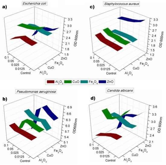 Optical density obtained for cultures after 24 h of incubation with four concentrations of nanoparticles: (a) E. coli; (b) S. aureus; (c) P. aeruginosa; (d) C. albicans.
