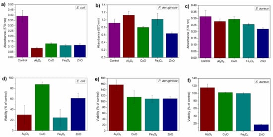 Adherence was tested in the biofilm formation assay, which tested both the viability of cells forming biofilm and its biomass. Tested nanoparticles were able to reduce the formation of biofilms in studied bacteria, although there was no statistically significant difference between the samples of C. albicans (data not shown). Nanoparticles successfully affected the formation of bacterial biofilms. Similarly to previous experiments, results here were also different in terms of used bacterium. E. coli ATCC® 8739™ biofilms were inhibited by all nanomaterials, although the viability of cells in biofilm was not completely reduced. Similarly to the results gained in 4-h toxicity test, CuO nanoparticles only slightly reduced the viability of cells. In that case, the biomass and the number of cells (viability) were lower than in the control samples. P. aeruginosa and S. aureus biofilms were significantly affected by ZnO nanoparticles, in which biomass was lower than in the controls; this occurred similarly with the viability of cells in the case of S. aureus. The viability of P. aeruginosa cells was comparable to the control sample with the exception of sample incubated with Al2O3 nanoparticles, in which it was significantly higher. These nanoparticles reduced the biofilm and viability of E. coli. The results are presented in Figure 6. All described results were statistically significant with p < 0.05.