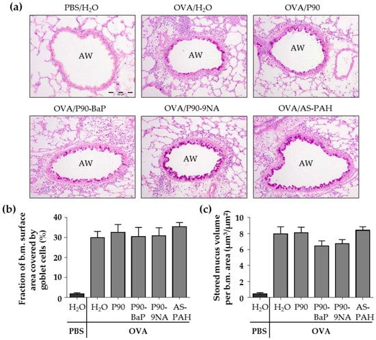Our results showed that the exposure to the PAH-containing CBNP, P90-BaP, P90-9NA, and AS-PAH, did not change the mRNA expression of the mucins compared to the OVA/H2O group (Table 3). However, P90 had different effects in the tracheal and intrapulmonary epithelial cells. P90 increased the mRNA expression of Muc5ac in the tracheal epithelial cells and decreased the mRNA expression of Muc5b in the intrapulmonary airways (Table 3).