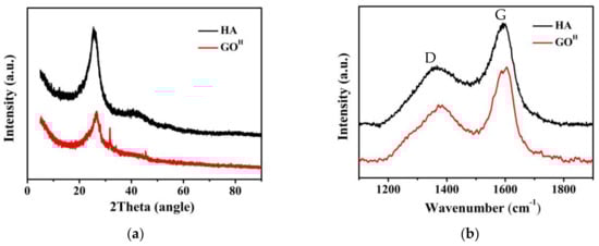 (a) X-Ray Diffraction (XRD) patterns; (b) Raman spectra of HA and GOH.