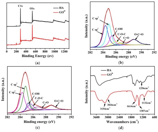 Figure 2a shows the typical XRD patterns of HA and GOH. It can be seen that the HA exhibits strong (0 0 2) diffraction peak at ~26°, indicating the π−π stacking of graphitic carbons [], which is consistent with the SEM results. By contrast, GOH shows relatively weak (0 0 2) diffraction peak, suggesting the few atomic layers structure of GOH. Raman spectroscopy was used to further check the crystalline quality of the HA flakes and GOH by monitoring the relative intensity of the D peak (associated with sp3 carbon atoms or defects, at ~1370 cm−1) and the G peak (revealing sp2 plane of graphene sheets, at ~1595 cm−1). The GOH demonstrates an ID/IG ratio of 1.09 (Figure 2b), which is similar to that of the GOG []. It is worth mentioning that the GOH possesses a lower ID/IG value than its counterpart (1.28), suggesting more sp2 hybridized carbon domains, less lattice distortions and defects. It can be concluded that non-aromatic components within the humic acid can self-assemble into graphitic hexagonal matrix under hydrothermal conditions, resulting in an increased sp2 carbon content of GOH. The UV-vis absorption spectrum of GOH solution presents a strong absorption peak at 230 nm (Figure S1), which is related to the π−π* transition of aromatic sp2 domains [].