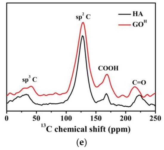 The XPS survey spectra shows C1s peaks at ca. 285.7 eV along with O1s peaks at ca. 532.6 eV (Figure 3a), indicating that GOH has a lower C/O atomic ratio (2.76) than HA (3.53). The deconvoluted C1s peak of GOH discloses the presence of 32.0 atom % of sp2 C=C (284.3 eV), 28.7 atom % of sp3 C−H/C−C (284.9 eV), 13.8 atom % of C−OH (285.3 eV), 7.8 atom % of C−O−C (285.8eV), 4.4 atom % of C=O (286.7 eV) and13.4 atom % of C(O)−O (288.8 eV) groups (Figure 3b) []. It is worth noting that, compared to GOH, the HA possesses lower content of C=C (29.9%), C−OH (7.5%) and C(O)−O (10.0%), whereas higher content of C−H/C−C (34.6%), C−O−C (10.5%) and C=O (7.6%) (Figure 3c). The FTIR spectra further identify the changes of functional groups before and after the hydrothermal processing of HA (Figure 3d). Compared with HA, the GOH shows a stronger aromatic C=C peak from oxidized sp2 bonds at 1614 cm−1 and tertiary C−OH peak at 1387 cm−1, new peaks including phenolic−OH at 1132 cm−1, the −OH of −COOH at 3154cm−1 and sp2 hybridized carbon networks of 3026 cm−1 (shoulder peak). However, the peak at 1256 cm−1 related to C−O stretching of aryl ethers and epoxy symmetric rings disappeared []. The 13C NMR spectra of HA and GOH are shown in Figure 3e. Compared to HA, the GOH exhibits higher percentages of aromatic carbons (~130 ppm) and −COOH groups (~168 ppm) related to total carbon, while lower aliphatic carbons (~35 ppm) and C=O groups (~218 ppm).