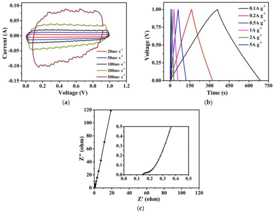 The CV profiles of r-GOH exhibits nearly rectangular shapes even at a high scan rate of 500 mV·s−1 (Figure 5a), indicative of the typical double-layer capacitive behavior and high rate capability. The GC curves at different current densities have triangular shapes (Figure 5b), meaning good reversible charging-discharging characteristics as supercapacitor electrodes. The area capacitance of the r-GOH electrode is 28 µF·cm−2 at a current density of 0.1 A·g−1, comparable to or even higher than that of highly functionalized activated carbons [], nanoporous carbons [] and porous 3D few-layer graphene-like carbon []. High capacitance retention of 76.2% is obtained for a 100-time increase in charging current density from 0.1 A·g−1 to 10 A·g−1, which agrees with the results of CV. EIS plot (Figure 5c) exhibits a closed 90° slope at a high frequency and a near-vertical line intersection with the real axis at low frequency, indicating a pronounced capacitive behavior and fast ion diffusion. Moreover, the r-GOH shows a low equivalent series resistance of 0.15 Ω (inset in Figure 5c). Meanwhile, the equivalent series resistance of r-GOH is lower than those of reduced graphene oxide nanosheets prepared from humic acid by preliminary carbonization coupled with oxidation-exfoliation-thermal reduction (0.17 Ω) [], 3D nitrogen-doped activated graphene-like nanosheets (0.38 Ω) [] and edge-nitrogenized graphene nanoplatelets (up to 0.35 Ω) []. The satisfactory electrochemical performances of r-GOH are ascribed to its developed mesoporous structure and good electrical conductivity.