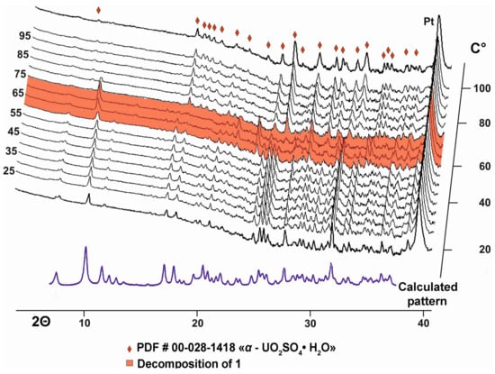 Evolution of the powder diffraction patterns of 1 as a function of temperature. Patterns in the temperature range of decomposition of 1 into “UO2SO4·H2O” (PDF # 00-028-1418) are marked in red.