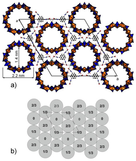 General view of the structure of 1 along the c axis showing the cross-section of the nanotubules (a). Phenylglycine molecules between the tubules are parallel to each other due to the effect of π–π interactions. Scheme of arrangements of nanotubules in the structure of 1 (b). The action of space group R3m results in neighbouring nanotubules being shifted by 1/3 or 2/3 along the c axis in accordance with the R-centering.