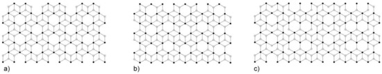 Nodal representation of [(UO2)3(TO4)5]4− (T = Mo, Se) layers in [C3N2H12](H3O)2[(UO2)3(MoO4)5] [16], Na6[(Np5+O2)2(Np6+O2)(MoO4)5](H2O)13 [17], Mg2[(UO2)3(SeO4)5](H2O)16 [18], M2[(UO2)3(SeO4)5](H2O)16 (M = Co., Zn) [19] (a). The topology of the layer corresponding to the unfolded uranyl-selenate nanotubules in the structures of K5[(UO2)3(SeO4)5](NO3)(H2O)3.5 [7], (H3O)2K[(H3O)@([18]crown-6)][(UO2)3(SeO4)5](H2O)4 [8] (b) and. (C4H12N)14[(UO2)10(SeO4)17(H2O)] [9] (c).