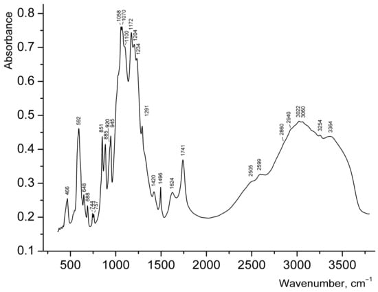 Broad strong bands (Figure 5) in the range of 3200–3500 cm−1 in the IR spectrum of 1 can be assigned to N–H and O–H stretching vibrations. Taking into account that salts of secondary amines do not contain strong bands above 3320 cm−1 [20,21] the band at 3364 cm−1 can be assigned to covalent O–H bonds in H2O. Bands of H–O–H bending vibrations in the range of 1700–1800 cm−1 are usually indicative of hydronium cations [22,23,24], but this band could not be reliably detected in the IR spectrum of 1, because of the presence of the strong band of C=O stretching vibrations of carboxyl groups at 1741 cm−1. The band at 1624 cm−1 may correspond to H–O–H bending vibrations of H2O molecules, but it is to be noted that bands in the region from 1620 to 1560 cm−1 are also characteristic for secondary amine salts (H–N–H bending vibrations [20]). The broad IR absorption in the range of 2800–3200 cm−1 is mainly due to N–H stretching vibrations. The bands at 2599 and 2505 cm−1 correspond to acid groups.
