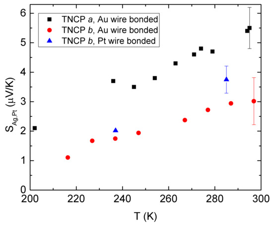 To cancel out the effect of the additional thermovoltages emerging in the results, we have bonded TNCP b by making use of Pt bond wires. The results, depicted in Figure 3 and Table 1, indicate an improvement in the Seebeck coefficient determined by TNCP b, while Pt wires are utilized, but still, the same data as with TNCP a are not realized. This can be explained as follows: There can be a small difference between the absolute Seebeck coefficient of the bond wire and of the thin platinum bond pad around room temperature, as reported in [24]. This difference gets larger with decreasing bath temperature. Therefore, a small temperature gradient along the system bond pad (Pt)-bond wire (Pt) can lead to an additional thermovoltage, which results in higher offsets. This offset is even higher with the system bond pad (Pt)-bond wire (Au).