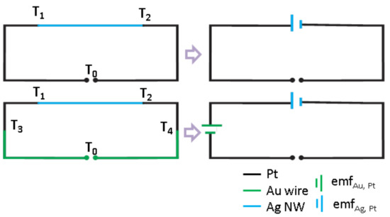 Now considering this fact, it may happen that the generated heat in TNCP b distributes through the whole area at the heated side and reaches even the bond pads at the chip edge. The Pt bond pads are bonded with gold wires. As a consequence of the temperature gradient at the joint of two different metals, an additional thermovoltage is generated at the interface, which contributes to the nanowire’s measured Seebeck voltage. This possibility is schematically illustrated in Figure 5. and are the temperature values at both sides of the nanowire. and represent the temperature at the bond pads.