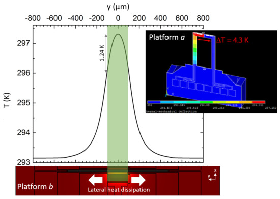 To seek the difference in the Seebeck value measured in TNCP b, we reconsider both platform designs. Platform a, as all the heat generated by the heater is concentrated in the cantilevers, benefits from a localized heat area. Additionally, the bond pads are all far from the heating zone, placed at the same thermal level. Platform b lacks such a possibility, and the generated heat can penetrate into the heated halve of the chip (see Figure 4a,b). This lack of heat concentration is clearly shown in the diagram depicted in Figure 4c. To achieve similar temperature gradients across the gaps, one magnitude of order more power must be applied to the heater in the new TNCP.