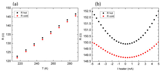 (a) Thermometers’ “hot” and “cold” electrodes’ calibration. (b) Thermometers’ resistance evolution with respect to the current applied to the microheater, at room temperature.