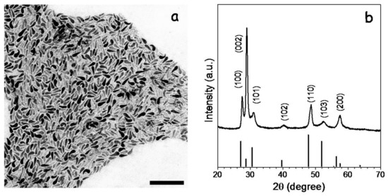 Representative TEM micrograph (a) and XRD pattern (b) of CGS NCs with wurtzite crystal phase. TEM scale bar = 200 nm. The JCPDS (Joint Committee on Powder Diffraction Standards) 001-1280 phase standard card, corresponding to wurtzite CGS, is included as a reference [16].