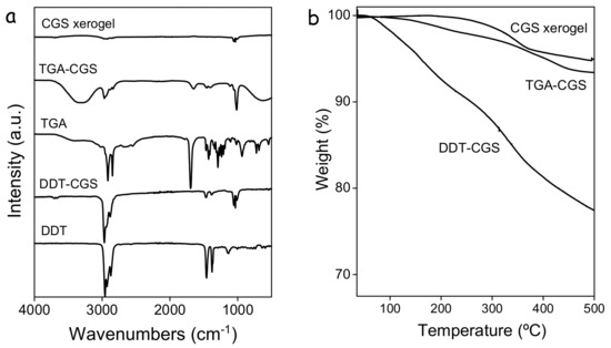 (a) from bottom to top: FTIR spectra of DDT; as-prepared CGS NCs (DDT-CGS); TGA; NCs functionalized with TGA (TGA-CGS); and the NC xerogel obtained by exposing TGA-NCs to the oxidant solution and naturally drying them; (b) thermogravimetric profile of the DDT-CGS NCs, TGA-CGS NCs and CGS xerogel.