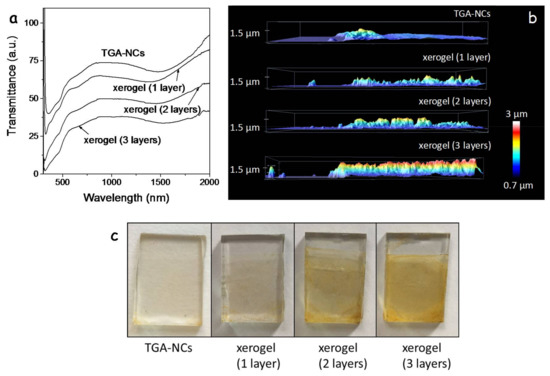 (a) transmittance spectra of films produced from as-synthesized NCs, TGA-NCs, and xerogel films with different numbers of layers (1 layer, 2 layers; 3 layers); (b) thickness profiles of the produced films; (c) optical photographs of the films.