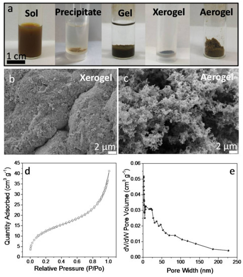 (a) optical images of the CGS NC-based sol, precipitate, gel, aerogel and xerogel; (b) SEM micrograph of a CGS xerogel; (c) SEM micrograph of a CGS aerogel; (d) adsorption/desorption isotherm cycle from a CGS NC-aerogel, and (e) its corresponding BJH pore size distribution.