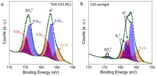 S 2p region of the XPS spectra of the TGA-CGS NCs (a) and the CGS NC-based aerogel (b). S 2p3/2 states are plotted in blue and S 2p1/2 states in red. In the same region, the Ga 2s state is observed.