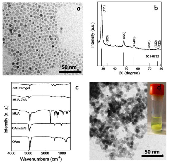 ZnS NCs were produced following the procedure reported by Hyeon et al. [19], reacting ZnCl2 with elemental sulfur in OAm at 320 °C (see details in the experimental section). ZnS NCs produced following this procedure displayed the sphalerite crystal structure and quasi-spherical geometry with an average size of 10 nm (Figure 7a,b). The growth of ZnS NCs and their colloidal stability were controlled by the presence of OAm at their surface as observed by FTIR characterization (Figure 7c) and reported previously [20]. We replaced OAm with MUA by shaking and sonicating a bi-phase solution of OAm-ZnS NCs in hexane and MUA in methanol. Through this process, ZnS NCs moved from the hexane to the methanol phase, where they were stabilized by MUA (MUA-ZnS). Then, the upper hexane solution containing the displaced OAm was discarded and the MUA-ZnS NCs in the methanol solution were collected and further purified as described in the experimental section.