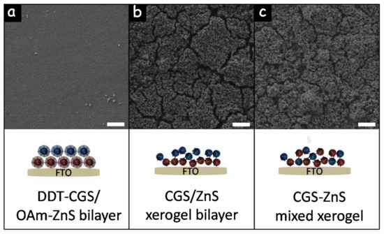 Combining p-type CGS with n-type ZnS in bilayer structures or blended layers should allow a more effective separation of photogenerated charge carriers, reducing charge recombination and promoting photocatalytic performance. Additionally, a faster charge carrier separation should promote the material chemical stability, since metal sulfides suffer from significant photocorrosion during photocatalytic reactions associated with the surface accumulation of photogenerated holes that induce rapid oxidation of lattice S2− ions to S0 or soluble sulfates [22,23]. Therefore, beyond single component films, we produced CGS/ZnS bilayers and CGS-ZnS mixed layers. Figure 8a,b show top-view SEM micrographs of CGS/ZnS bilayers produced from the sequential spin-coating of DDT-CGS and OAm-ZnS NCs (Figure 8a) and from the sequential spin coating and gelation of TGA-CGS and MUA-ZnS NCs (Figure 8b). Figure 8c shows a top-view SEM micrograph of the layer produced from the spin coating and subsequent gelation of a solution containing a blend of TGA-CGS and MUA-ZnS NCs. Note that a thermal treatment (250 °C for 60 min under Ar atmosphere) was required to stabilize the DDT-CGS layer before deposition of the OAm-ZnS NCs layer, in order to prevent dissolution of the former. However, such thermal treatment was not necessary for layer deposition on top of gelated materials. This represents a clear advantage over multiple layer deposition procedures that require an annealing step in between each process.