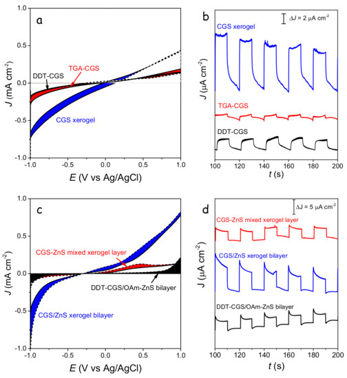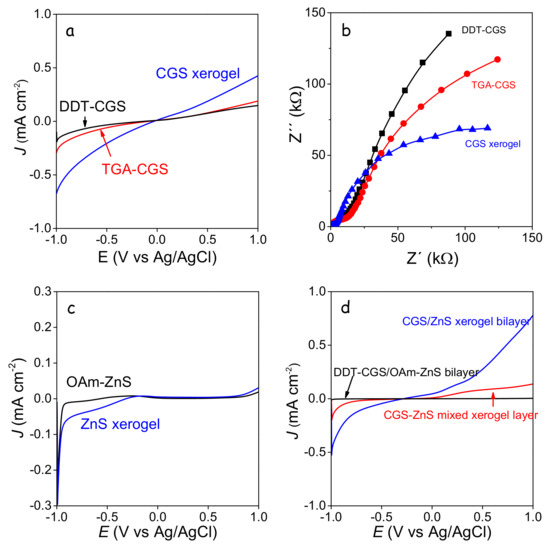 (a) linear sweep voltammogram curves at a scan rate of 0.1 V·s−1 of DDT-CGS, TGA-CGS and gelated TGA-CGS NC-based layers; (b) Nyquist plots for DDT-CGS, TGA-CGS and CGS xerogel films; (c) linear sweep voltammogram curves at a scan rate of 0.1 V·s−1 of OAm-ZnS and gelated MUA-ZnS NC-based layers; (d) linear sweep voltammogram curves at a scan rate of 0.1 V·s−1 of DDT-CGS/OAm-ZnS NC-based bilayer, a gelated TGA-CGS/MUA-ZnS NC-based bilayer and a gelated layer produced from a blend of TGA-CGS and MUA-CGS.