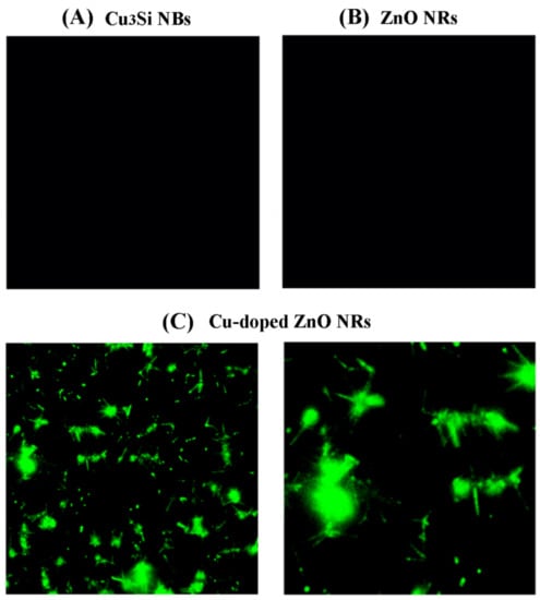 Fluorescence panels of the Cu3Si NB, Cu-doped ZnO NRs on Cu3Si NB, and neat ZnO NR samples shown in Figure 1. No fluorescence emission was seen in the visible range from the samples containing (A) Cu3Si NBs and (B) undoped ZnO NRs; (C) In contrast, strong fluorescence from the samples of ZnO NRs grown on Cu3Si NBs was observed due to the doping of ZnO NRs with Cu from Cu3Si NB catalysts. The fluorescence images in (A,B) are 300 μm × 300 μm in size. The left and right panels shown in (C) are 160 μm × 160 μm and 50 μm × 50 μm, respectively.