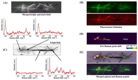 Representative panels displaying spatially correlated data between optical, fluorescence emission, and Raman scattering profiles measured from individual NBs with Cu-doped ZnO NRs. (A,B) The optical panel in (A) displays a superimposed, bright- and dark-field image of Cu-doped ZnO NRs on a Cu3Si NB. The corresponding fluorescence emission profiles along the NB are shown in panel (B) where the top and bottom frames display the emission collected at wavelength ranges of 510–540 nm and 575–640 nm, respectively; (C) Exemplar Raman spectra spatially resolved along the length of the NRs/NB module are presented; (D) The E2H peak shift, characteristic of Cu-doped ZnO NRs grown on a Cu3Si NB, is mapped along the NB via NB position-resolved Raman spectroscopy; (E) The top and bottom panels are the merged view of bright-field and E2H Raman peak shift (top) and that of fluorescence and E2H Raman peak shift (bottom). All bright-field, fluorescence, and mapped Raman images shown are 4.5 μm by 20 μm in size.