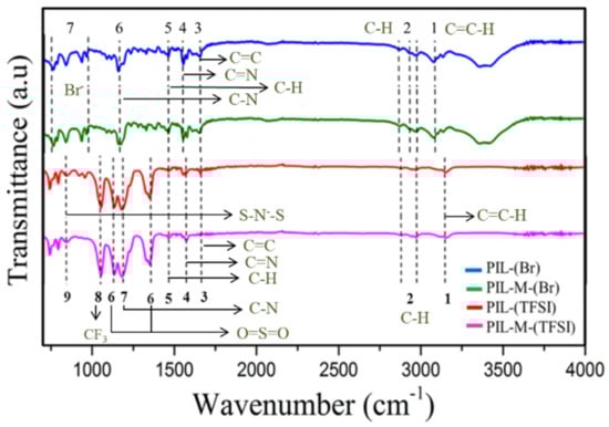 | No. | PIL-(Br) | PIL-M-(Br) | Assignment | PIL-(TFSI) | PIL-M-(TFSI) | Assignment |