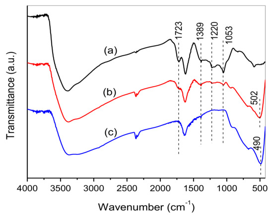 The presence of graphene in the HTT/graphene nanocomposites could be confirmed using FTIR spectra (Figure 2). Bare GO exhibits several characteristic peaks belonging to oxygen functional groups, such as C=O stretching at 1723 cm−1, O–H deformation at 1389 cm−1, C–OH stretching at 1220 cm−1, and C–O stretching at 1053 cm−1 [20,34]. Compared with that of bare GO, the spectrum of HTT/graphene-1.0% shows a significant decline in intensity for peaks associated with oxygen-containing groups (i.e., C=O, O–H, C–OH, and C–O), indicating that GO in the composites is reduced. Additionally, the strong absorption band centered at 490 cm−1 can be assigned to the Ti–O–Ti stretching vibration in the pure HTT sample. A slight blue shift can be observed in the FTIR spectrum of HTT/graphene-1.0% (centered at 502 cm−1), suggesting an interfacial interaction between graphene and HTT in the nanocomposites.