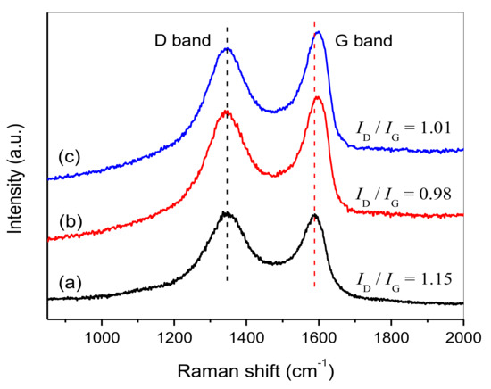 Raman spectroscopy is also widely employed to characterize the electronic structure of carbon products. Two bands are observed in the 850–2000 cm−1 range for GO and HTT/graphene nanocomposites, as shown in Figure 3. They are the D band and G band of carbonaceous materials [36]. The former denotes a common characteristic of carbon sp3 defects, and the latter gives information about the in-plane vibrations of sp2 bonded carbon [21,34]. The intensity ratio between D band and G band (ID/IG) represents the relative concentration of defects in GO or graphene. Compared with bare GO, the calculated ID/IG of the HTT/graphene composites are lower, demonstrating a lower concentration of defects in graphene. The decreased ID/IG ratios in HTT/graphene nanohybrids imply the employed hydrothermal process facilitates the formation of more graphene without reducing the average size of sp2 domains. Furthermore, it is worth noting that a G band up-shift from 1588 to 1596 cm−1 is observed for HTT/graphene compared with GO and graphene, which gives evidence for chemical bonding of carbon materials [37,38]. The results indicate significant interaction between graphene and HTT, consistent with the results of the FTIR investigation.