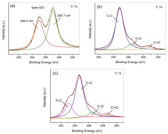 The interactions between HTT and graphene are further studied by XPS. The high-resolution C 1s XPS spectrum of bare GO is shown in Figure 5a. Two characteristic peaks can be observed at 285.0 and 287.1 eV, which correspond to adventitious carbon or sp2-hybridized carbon of GO and the oxygen-containing carbonaceous bands (C–OH) [20,39]. These oxygen-containing bands can provide active anchoring sites for HTT growth. The C 1s spectrum of the HTT/graphene-1.0%-mixed sample is deconvoluted into three peaks at binding energies of 284.6, 286.5, and 288.6 eV. The C 1s peaks located at 284.6 and 286.5 eV can be assigned to C–O or C=O groups (Figure 5b). The relative weak peak at 288.6 eV belongs to the O=C–O group. These results indicate that the –OH groups of HTT are likely to interact with the surface –COOH groups of GO via forming O=C–O bonds. Additionally, it can be seen the peak at 287.1 eV, belonging to the C–OH groups of GO, decreases significantly or disappears in the C 1s XPS spectra of HTT/graphene composites. This further demonstrates the successful reduction of GO to graphene through the hydrothermal process. The C 1s spectrum of in-situ synthesized HTT/graphene-1.0% can be deconvoluted into four peaks (Figure 5c). Besides the three peaks at 284.6, 286.5, and 288.6 eV— belonging to the C–C, C–O, and O=C–O groups—another shoulder peak centered at 283.2 eV is observed, which is attributed to forming chemical bonds (Ti–C) between carbon atoms and titanium atoms in the lattice of HTT. This is the first report on the formation of Ti–C bonds in nanocomposites of hydrogen titanate and graphene. The intimate interfacial contacts originated from the chemical bonding would benefit the migration of photogenerated charges and thus improve the photocatalytic activity of HTT.