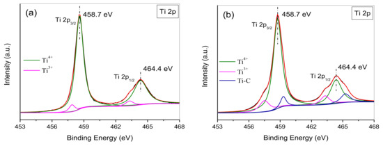 Forming Ti–C bonds is also investigated and identified by analyzing the Ti 2p XPS spectra of the HTT/graphene nanocomposites. As depicted in Figure 6a, in the Ti 2p spectrum of HTT/graphene-1.0%-mixed, two peaks are observed at binding energies of 464.4 and 458.7 eV. These peaks can be attributable to the Ti 2p1/2 and Ti 2p3/2 spin-orbital splitting photoelectrons of Ti4+. Two bands at binding energies of 463.3 and 457.7 eV usually correspond to Ti3+ [21,36]. In Figure 6b, besides the above-mentioned four characteristic peaks belonging to Ti4+ and Ti3+ in HTT, two other weak peaks located at 465.3 and 459.4 eV are found and are likely due to the forming of Ti–C bonds in the HTT/graphene nanohybrids. This suggests that a chemical interaction between HTT and graphene is present in as-synthesized HTT/graphene composites and absent in the mixed samples.