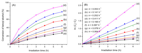 Additionally, the reaction kinetics of benzyl alcohol oxidation were investigated and the corresponding results are shown in Figure 8. As the reaction time is prolonged, slight decreases in the conversion yields of benzyl alcohol occur. Derived from the experimental data in Figure 8A, the kinetics of benzyl alcohol oxidation are shown in Figure 8B. A linear correlation between ln(C0/Ct) (C0 and Ct are the concentrations of benzyl alcohol at the initial time and at specific time intervals) and the reaction time is displayed, indicating the oxidation is pseudo-first order. The pseudo-first-order rate constant (k) of the HTT/graphene photocatalysts can be obtained from the slope. The rate constant (k) of benzyl alcohol oxidation over the optimal photocatalyst, HTT/graphene-1.0%, is 0.411 h−1, which is 5.3 and 6.4 times higher than those of the P25 TiO2/graphene-1.0% and HTT/graphene-1.0% -mixed samples.