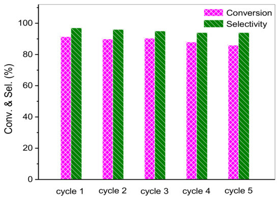 Recycled photoactivity test for five operational runs over the optimal HTT/graphene-1.0%, on selective oxidation of benzyl alcohol.
