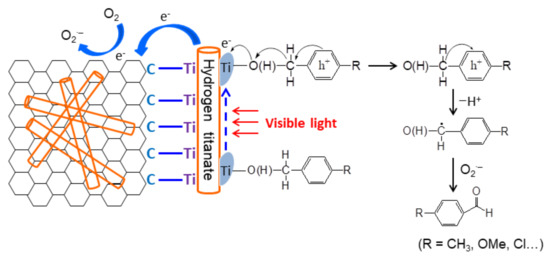 According to these results, a possible mechanism for the improved visible light catalytic activity over as-prepared HTT/graphene composites is proposed and depicted in Figure 13. Reactant benzylic alcohol is first adsorbed on unsaturated Ti site of HTT and generates the surface complex. A visible light induced LMCT process occurs, which produces an electron and a hole upon the in-situ formed surface complex. The photogenerated electron transfers into the conduction band of neighbor HTT and subsequently the surface of the graphene sheet via the in-situ formed Ti–C bonds, which can be trapped by adsorbed O2 to produce a superoxide anion radical. Meanwhile, the adsorbed benzylic alcohol transforms into an intermediate with a positive charge. Subsequently, the photogenerated hole drives the α-deprotonation of the intermediate and gives rise to a neutral carbon radical. Then the reaction between the substrate radical and superoxide species yields the product aldehyde. Compared to the HTT/graphene-mixed samples, the in-situ composited HTT/graphene catalysts possess significantly enhanced photocatalytic activity for the selective oxidation of benzylic alcohols under visible light illumination, as indicated in Figure 8 and Table 1. It can be mainly ascribed to the chemical-bonding effect and the resulting intimate interactions between HTT and graphene sheets, which facilitate the interfacial electron transfer from adsorbed alcohols to HTT and finally to graphene. The close interfacial contacts between graphene and HTT are not being able to form in the mechanical mixed composites. In brief, the improved oxidation efficiency of as-synthesized HTT/graphene composites is primarily ascribed to the interfacial charge transfer effect, which inhibits the recombination of photoinduced electron-hole pairs and thus enhances the photoactivity of alcohol oxidation.