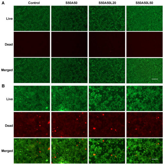After staining with the LIVE/DEAD fluorescent reagent, the alive cells were stained green while the apoptotic cells were stained red. The result showed most of the cells were green and only a few of cells were red (Figure 7), indicating that the SS/AR and SS/AR/LZM gels had good cytocompatibility on NIH3T3 and HEK293 cells. The fluorescence images of the LIVE/DEAD staining assay were in accordance with the results of CCK-8 assay.