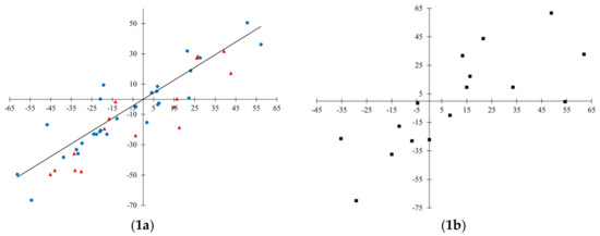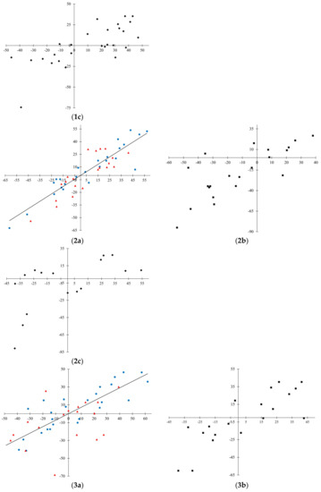 Observed-predicted diagrams for the developed models. Model 1: 1a—training in blue, validation in red; 1b—calibration; 1c—invisible training. Model 2: 2a—training in blue, validation in red; 2b—calibration; 2c—invisible training. Model 3: 3a—training in blue, validation in red; 3b—calibration; 3c—invisible training.