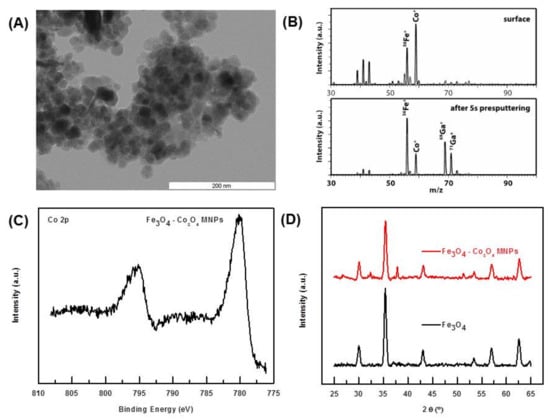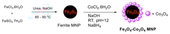 Fe3O4-Co3O4 MNPs were prepared by the simple wet impregnation method followed by chemical reduction, as reported in previous literature [47] (Figure 1). Characterization of nanocatalysts was accomplished by transmission electron microscopy (TEM), time-of-flight-secondary ion mass spectrometry (TOF-SIMS), X-ray photoelectron spectroscopy (XPS), X-ray diffraction (XRD), inductive coupled plasma atomic emission spectroscopy (ICP-AES), and SEM elemental mapping with energy dispersive X-ray spectrometry (EDS).
