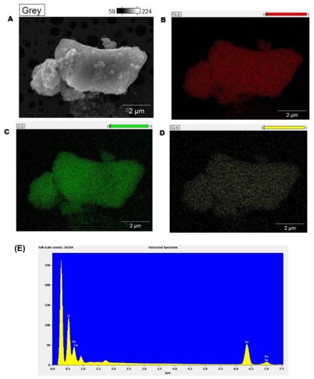 Elemental mapping (A–D) and energy dispersive X-ray spectrometry (EDX) analysis (E) of Fe3O4-Co3O4 nanocatalysts.