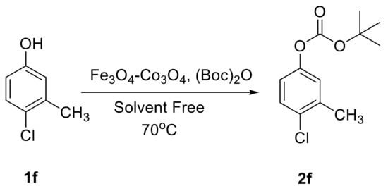 The present protocol entailed the treatment of different phenols with Boc (tert-butyloxycarbonyl) anhydride ((Boc)2O) in presence of Fe3O4-Co3O4 MNPs at 70 °C under solvent-free conditions for an appropriate length of time.