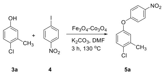 Catalytic activity was then explored for the O-arylation reaction of phenols. At first, the reaction condition was optimized using 4-chloro-3-methyl phenol and 1-iodo-4-nitro benzene as model substrates at 130 °C in the presence of the Fe3O4-Co3O4 catalyst (Figure 5). The effects of time, base, solvent and amount of catalyst on progress of reaction were investigated and results are provided in Table 3.