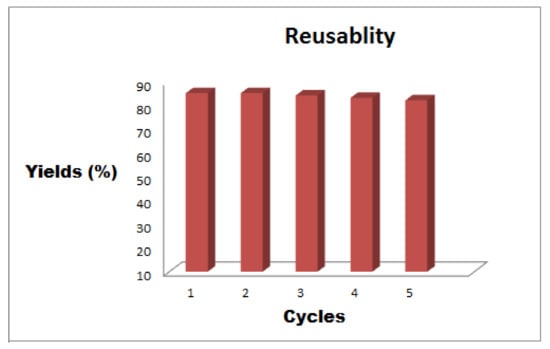 The recycling study of the catalyst was performed for O-tert-butoxycarbonylation of 4-chloro-3-methyl phenol with Boc anhydride using Fe3O4-Co3O4 MNPs as a nanocatalyst under optimized reaction conditions. The recycling experiments signified excellent conversions even later than six cycles (Figure 6). After each cycle, the catalyst was magnetically separated, washed with ethyl acetate three times and dried out at 120 °C in oven for 4 h, before being used for the next cycle. After the recyclability study, we did perform XRD of the reused catalyst and noticed that there was no change in the XRD pattern compared to the XRD pattern of the fresh catalyst (Figure S2). The standard deviation of reused catalysts is provided in Table S1.