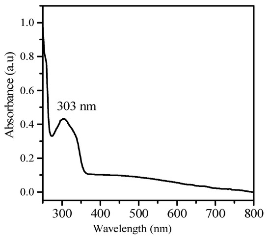 The addition of different concentrations of sterile, ice cold aqueous solution of AgNO3 to the cell free, washed water samples that were triggered the synthesis of NP. The synthesis was mediated under dark conditions at 37 °C. Synthesis of the NP was confirmed by the maximum absorption spectrum obtained at a 303 nm range (Figure 1). However, among the different concentrations, 1 mM was optimal for the maximum synthesis of the NP. Furthermore, a 1 mM concentration was used for the bulk level synthesis of the NP for routine lab work. The FTIR spectrum revealed a variation in the band values of the NP, especially from 500 to 3300 cm−1. This indicated the presence of various functional groups. The NP bands were detected at 1050.0, 1100, 1392.5, 1500, 1800, 1920, and 2900 cm−1 in the FTIR spectrum (Figure 2). Overall, the presence of various functional groups clearly indicates that the synthesized NP have attached to the surface of the various extracellular components from the active actinomycete strain.