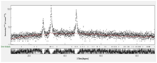 A high-resolution scanning electron microscope (HRSEM) image depicted that the synthesized NP diameter sizes were ranged from 20–50 nm (Figure 3). Also, it is interesting that the synthesized NP were spherical in shape. In the XRD studies, the selected part of the NP diffraction report clearly confirmed that the particle looks crystalline. Relatively, the transmission electron microscope (TEM) images of the synthesized NP aggregates on the copper grid, with the measuring size ranging from 10 to 17 nm (Figure 4). The XRD analysis indicated that the average particle sizes ranged from 9.7 to 17.25 nm (Figure 5). Figure 6 documented the X-ray powder diffractogram of NP from the extracellular components of the actinomycetes, including Rietveld refinement. Analysis indicated that the slight peak at 33°2Θ indicates the presence of a small amount of silver salts (ICDD PDF4 #031-1238) as a synthetic impurity. However, the size agreed with the HRSEM and TEM analysis. The stabilization of the particle size was evidenced by the image, which showed that the particles did not have contact within the aggregates. Figure 7 indicated that the NP was agglomerate in its appearance, with a slight dispersion in the other morphological surfaces.
